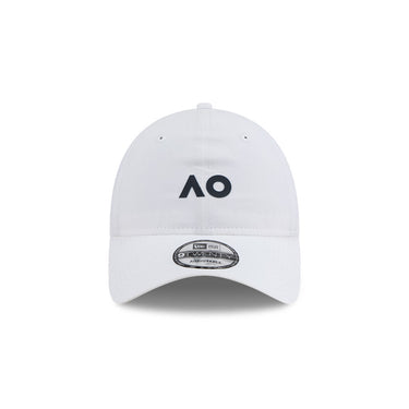 The Australian Open '26 White 9TWENTY Cloth Strap features an embroidered AO logo on a low-profile unstructured crown in a performance fabric, a contrast NE Flag logo on the left, and at the back an adjustable cloth strap enclosure.