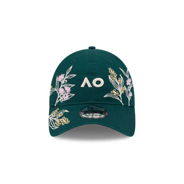 The Australian Open '26 Australiana Floral 9TWENTY Cloth Strap features a flat midi AO lettermark and native floral embroidery on a low-profile unstructured cotton crown, floral embroidery on the visor, a NE Flag logo on the left, and at the back an adjustable cloth strap enclosure.