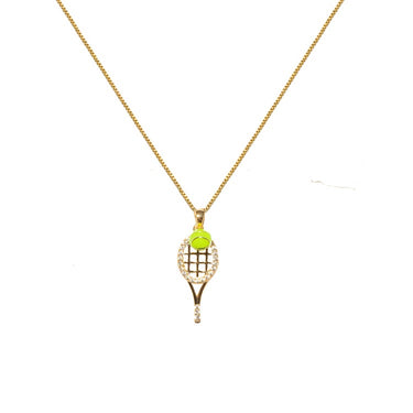 Wear with pride this beautiful gold plated necklace. It features a miniature tennis ball and sparkling racquet design. The necklace is likely intended for tennis enthusiasts and fans of the sport.