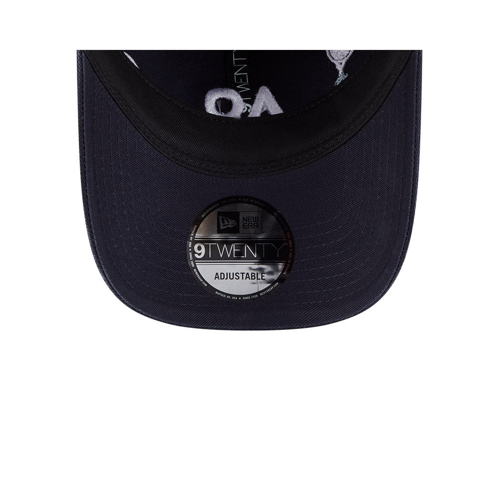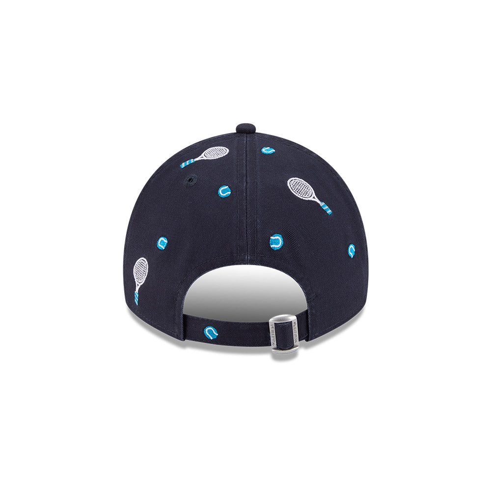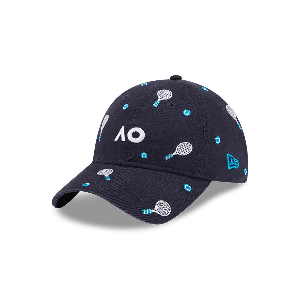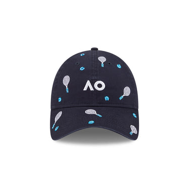The Australian Open '26 Racquet 9TWENTY Cloth Strap features a flat midi AO lettermark and tennis embroidery on a low-profile unstructured cotton crown, tennis embroidery on the visor, a NE Flag logo on the left, and at the back an adjustable cloth strap enclosure.